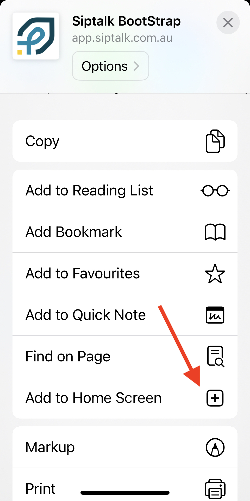 The app must be opened in Safari to see the option to add it to the home screen and for push notifications to work.